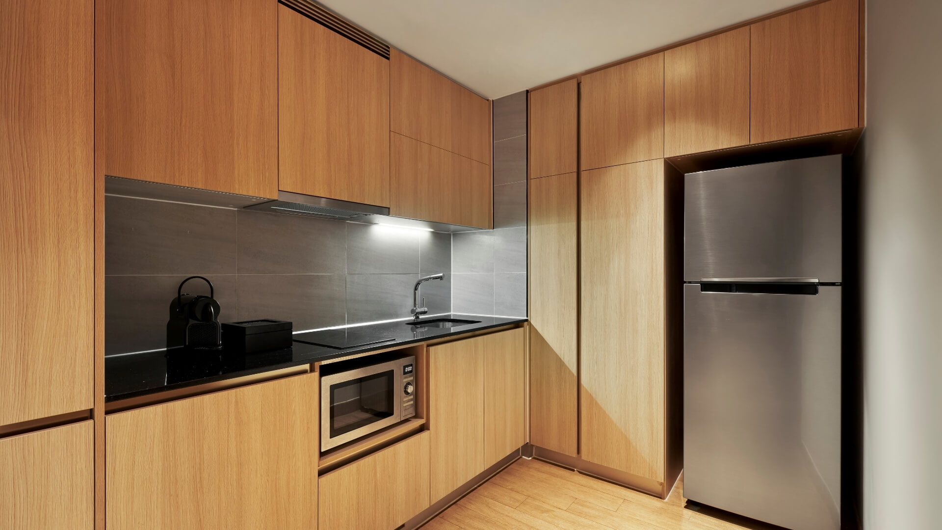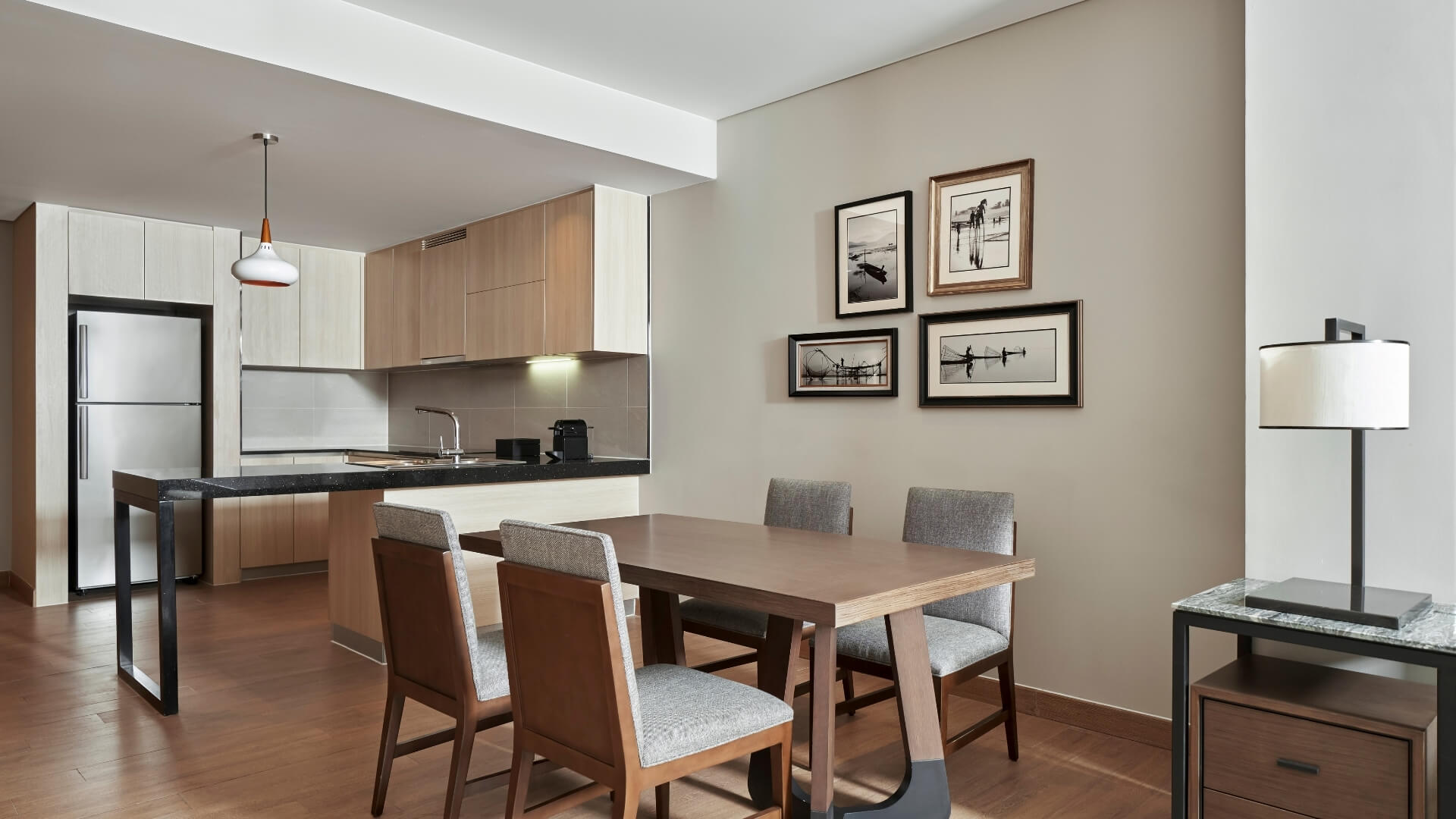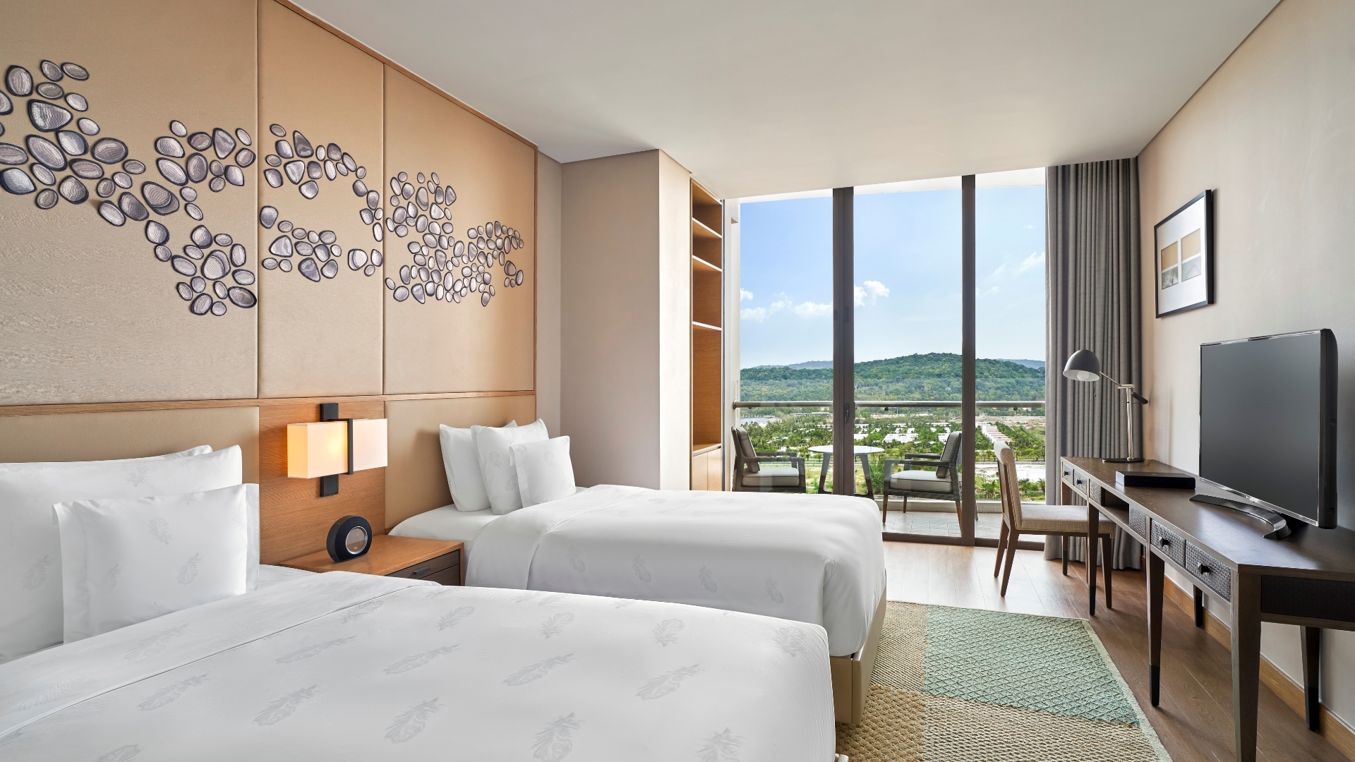 フーコックから着想を得た水をモチーフにしたサンゴ礁と青緑色のターコイズ・デザインが、リゾート施設に豊かな彩りを添えます。広々としたリビングルームとキッチンスペースでは快適さと利便性にこだわっています。