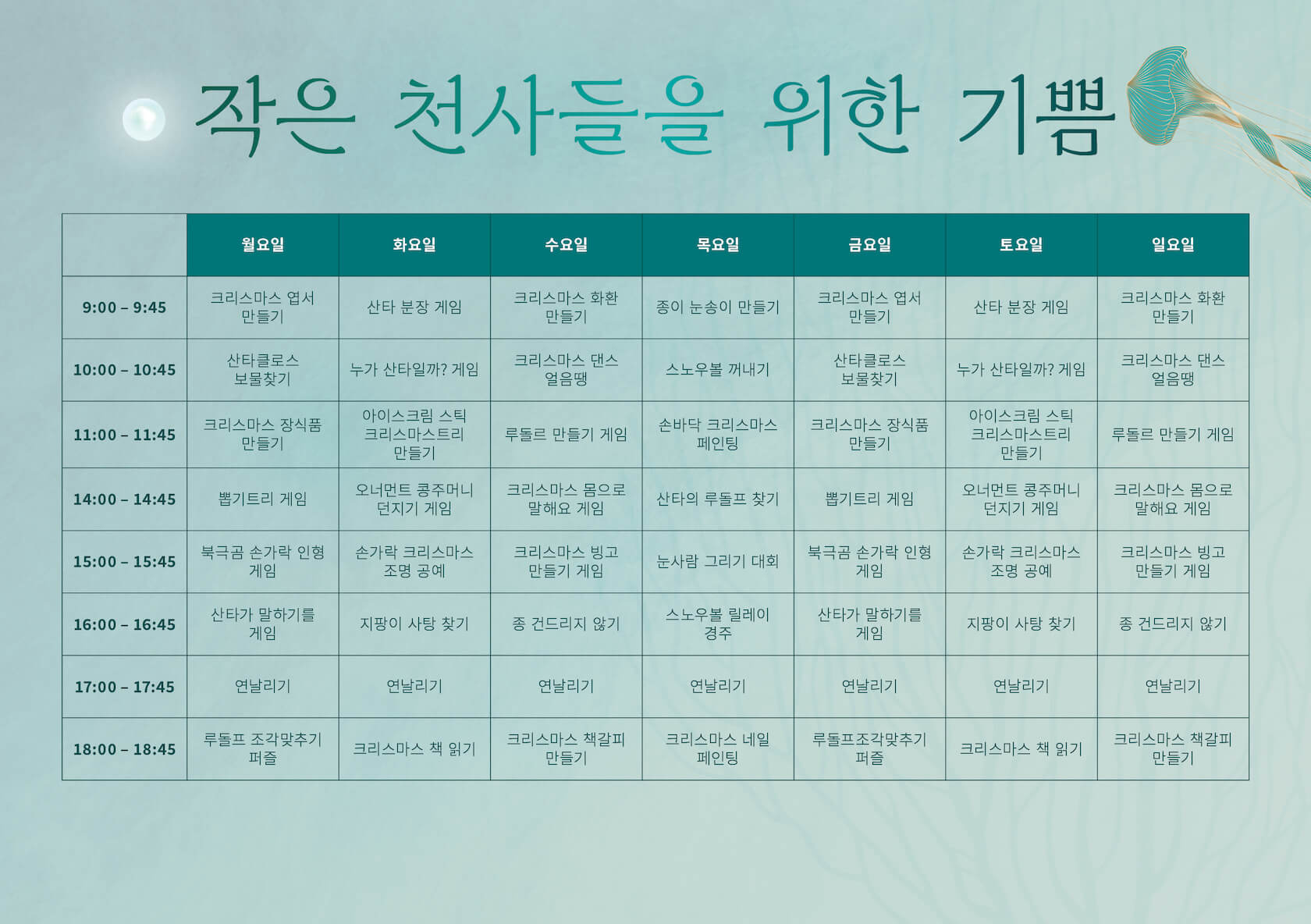 크리스마스 시즌이 다가오고 있습니다. 다 같이 한자리 모여 가슴으로부터 느껴지는 스파크업 더 오션 축하 이벤트를 즐기며 이 축제 시즌을 맞이할 시간입니다. 눈앞에 펼쳐질 멋진 순간을 감상할 들뜬 기분과 더불어, 지역 교회 합창단이 부르는 친숙한 크리스마스 캐롤을 들으며 이 행사를 위한 특별한 환영 음료를 다 같이 즐긴다면, 더욱 즐거운 시간을 보낼 수 있습니다!
