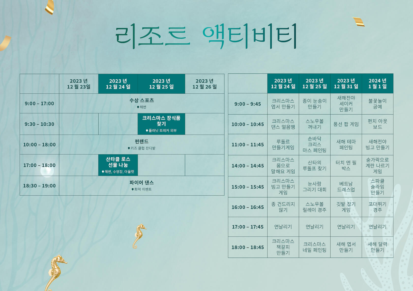 크리스마스와 함께 우리가 너무나도 좋아하는 산타 클로스가 찾아옵니다. 이 마법 같은 날의 행복한 순간, 산타는 작은 천사들에게 기쁨을 나눌 준비가 되어 있습니다. 리조트 주변을 산책하는 동안, 행복으로 가득 찬 선물보따리를 들고 있는 산타를 찾아보세요.